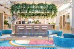 The art deco interior design features a vibrant colour palette in the main communal area, where a large central feature of a planting trough within circular banquette seating was particularly important. Clever use of mixed planting helps to bring it quite literally to life with a verdant variety of planting: ivy, eucalyptus and cordyline were chosen as an interesting juxtaposition of leaf shape and texture.