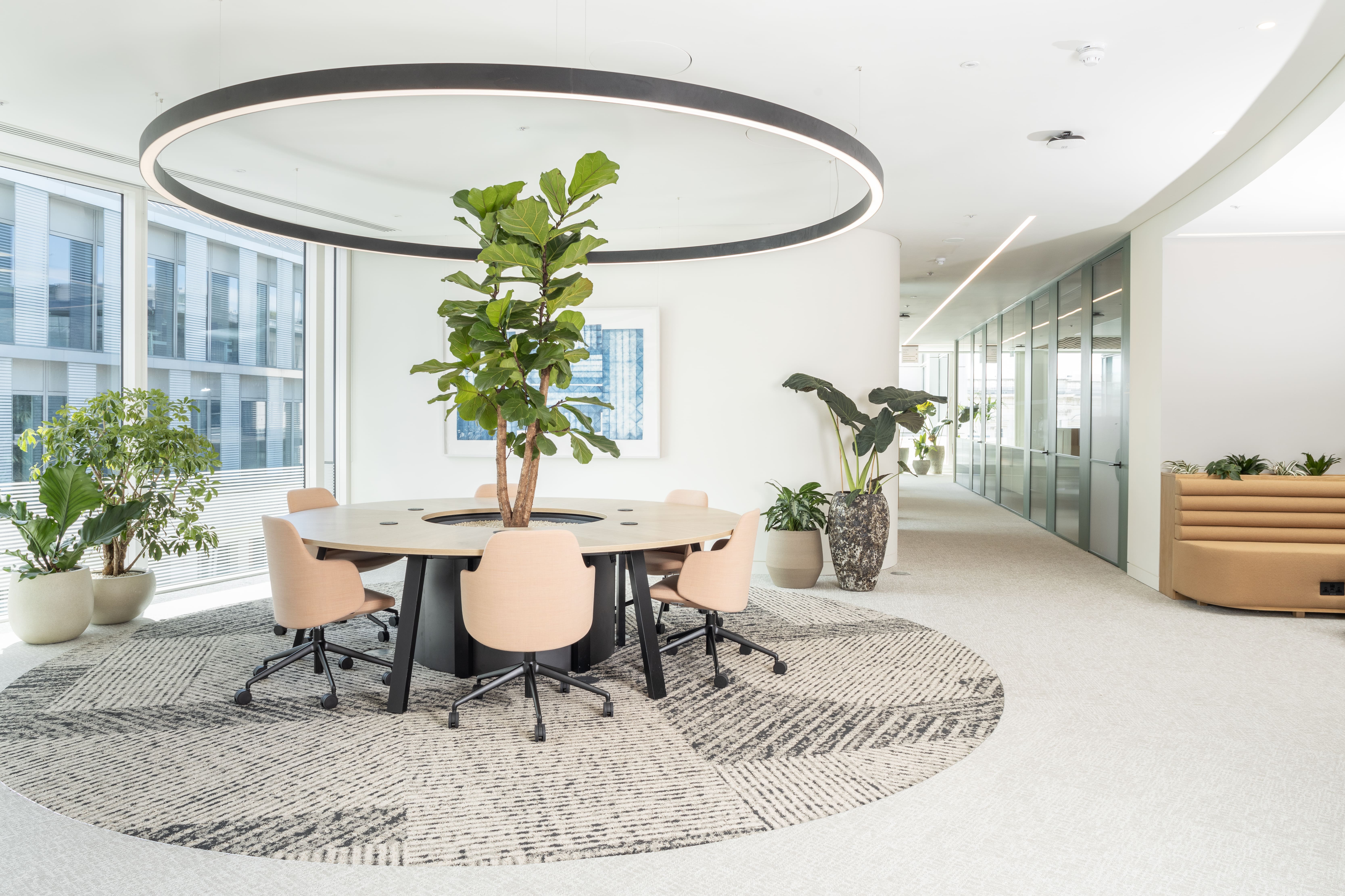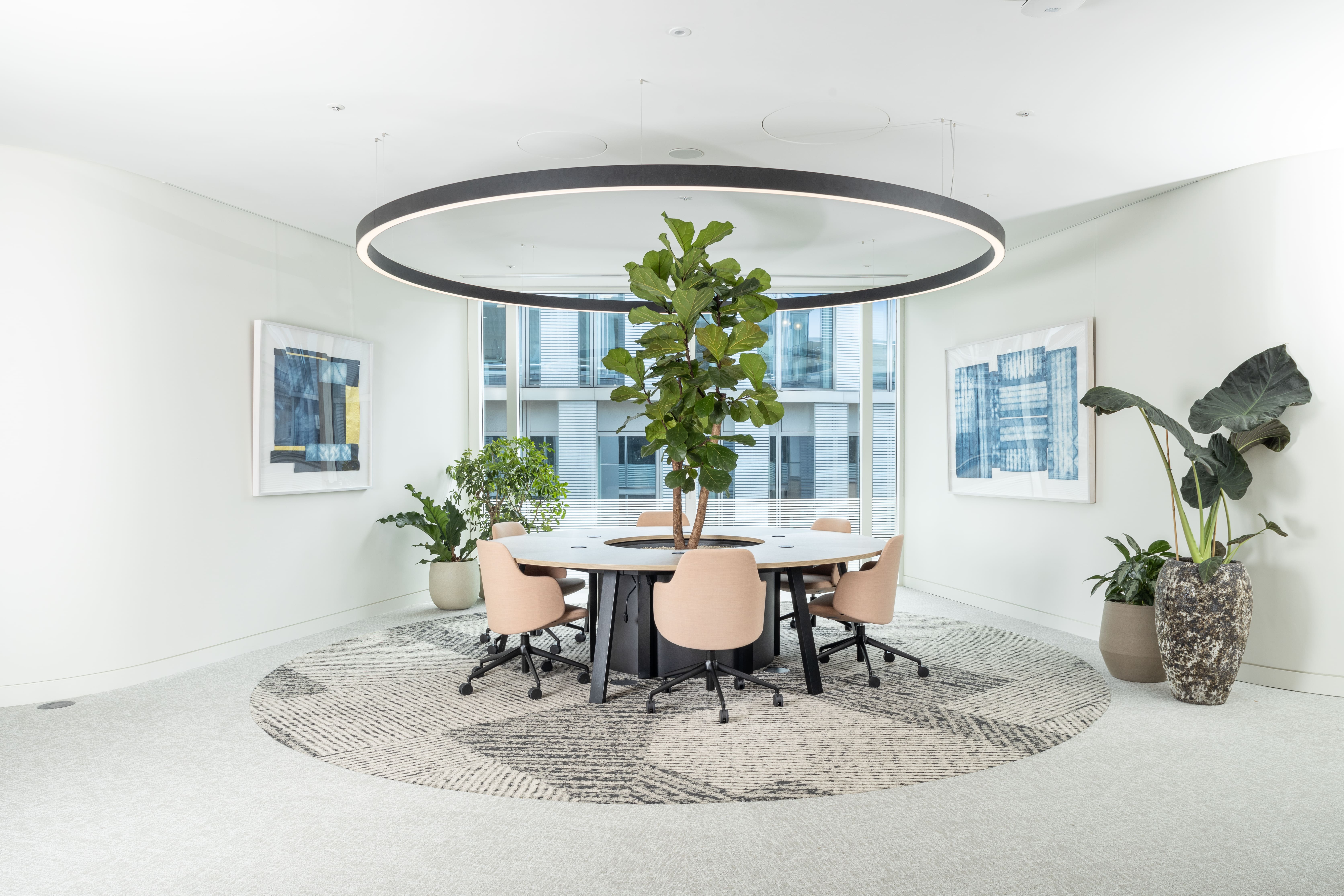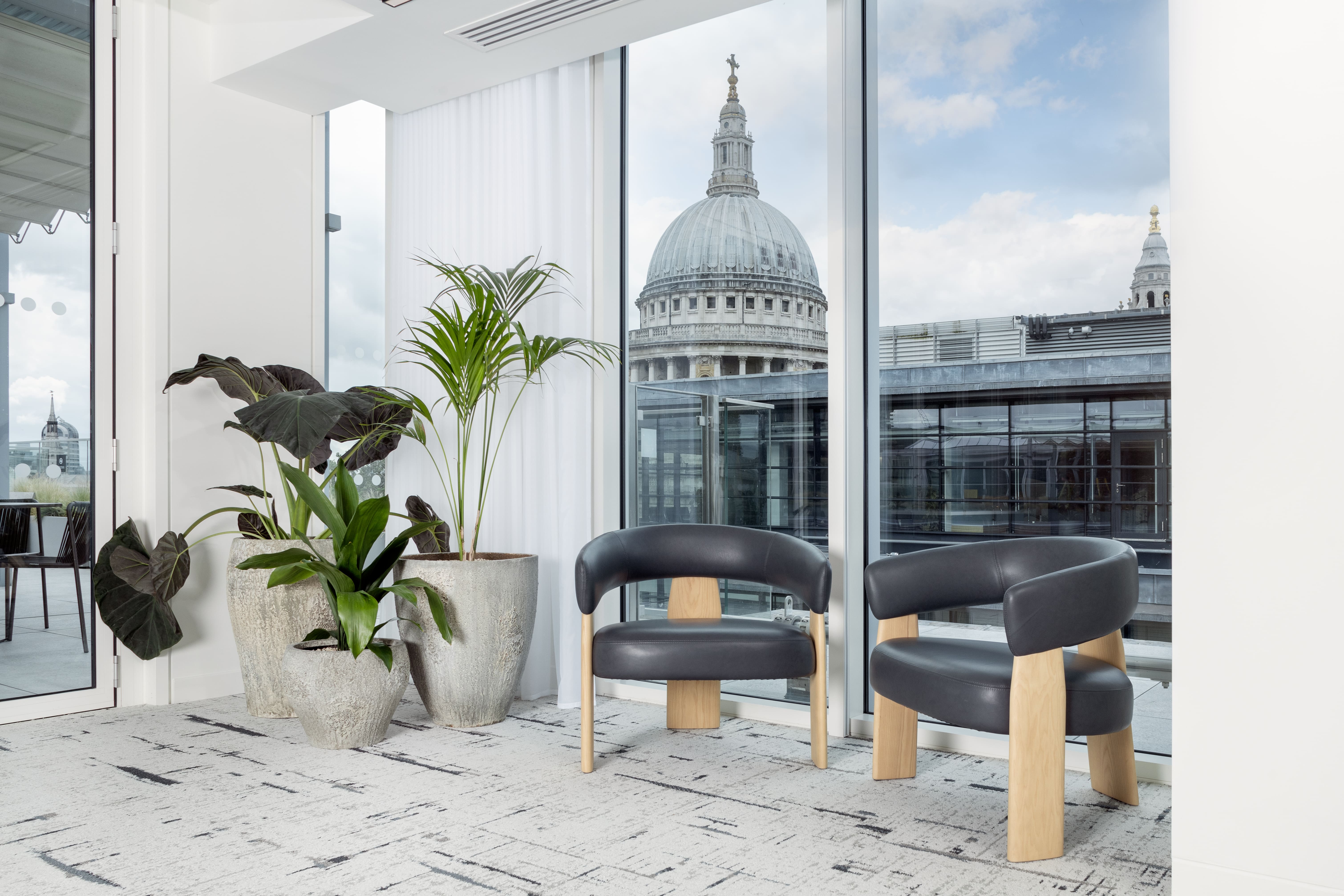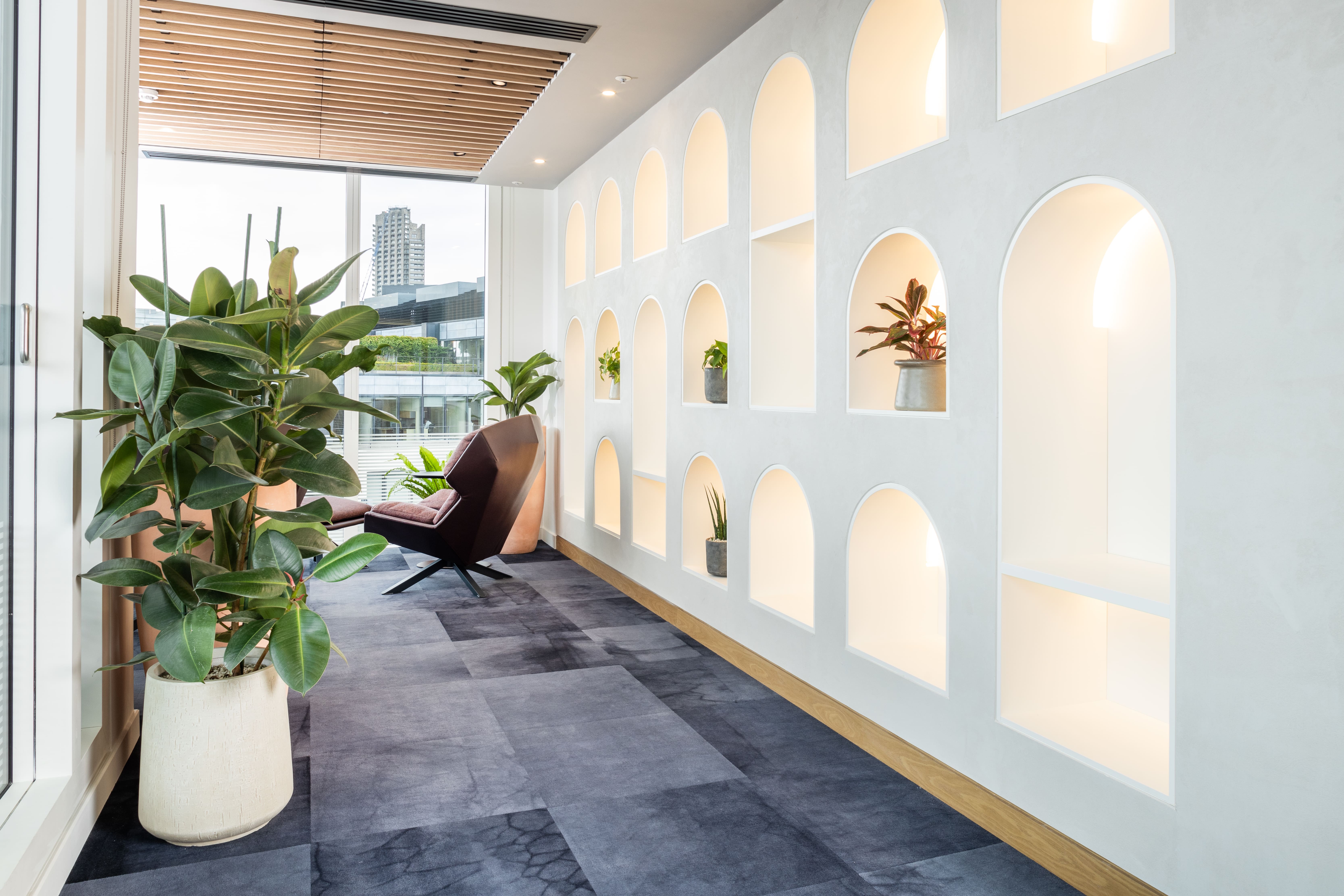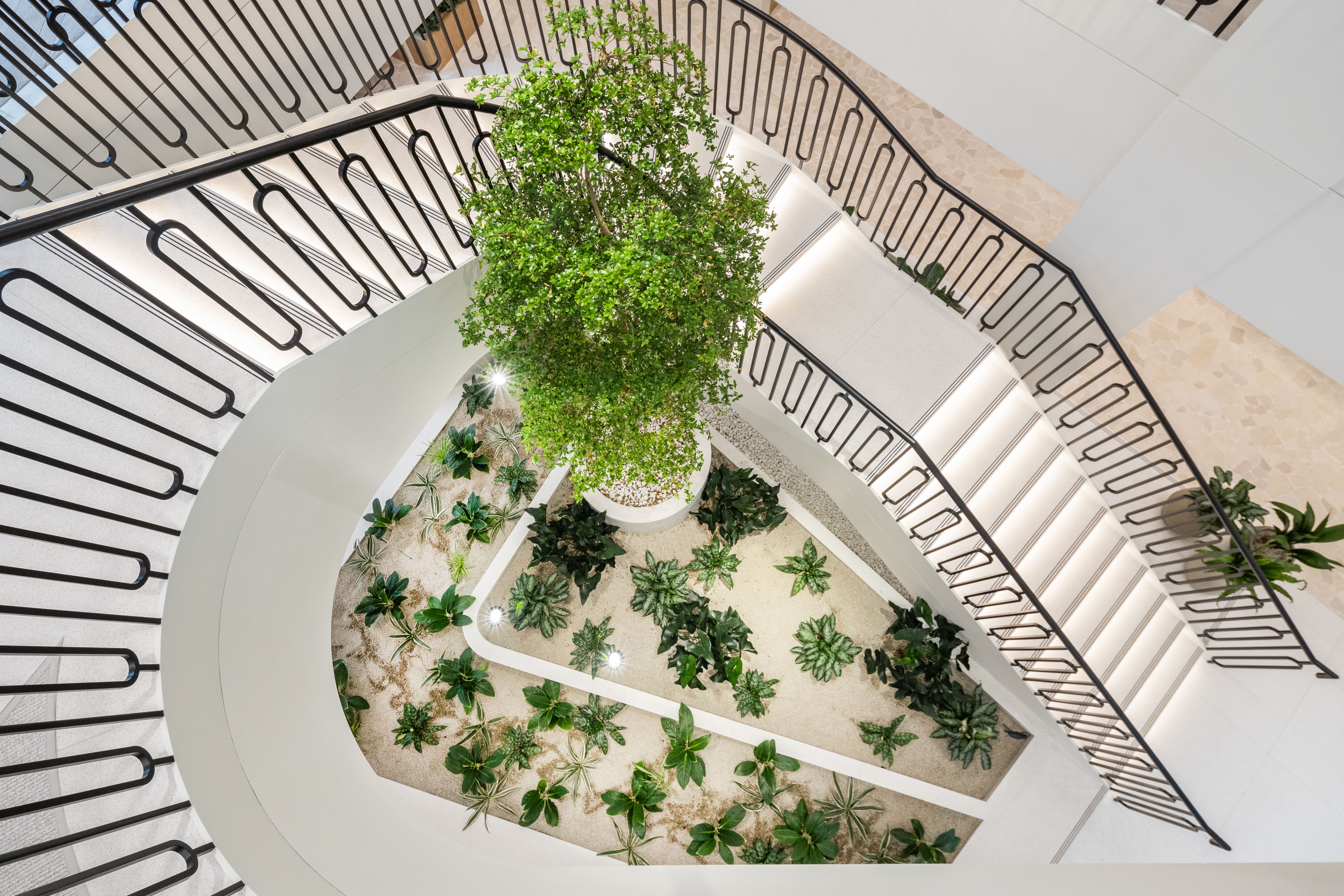 The Atrium Tree: A 4m Bucida Buceras anchors the central staircase, connecting two floors with a vertical line and echoing the soft arches found throughout the interior. This detail reflects the dome of nearby St Paul’s.