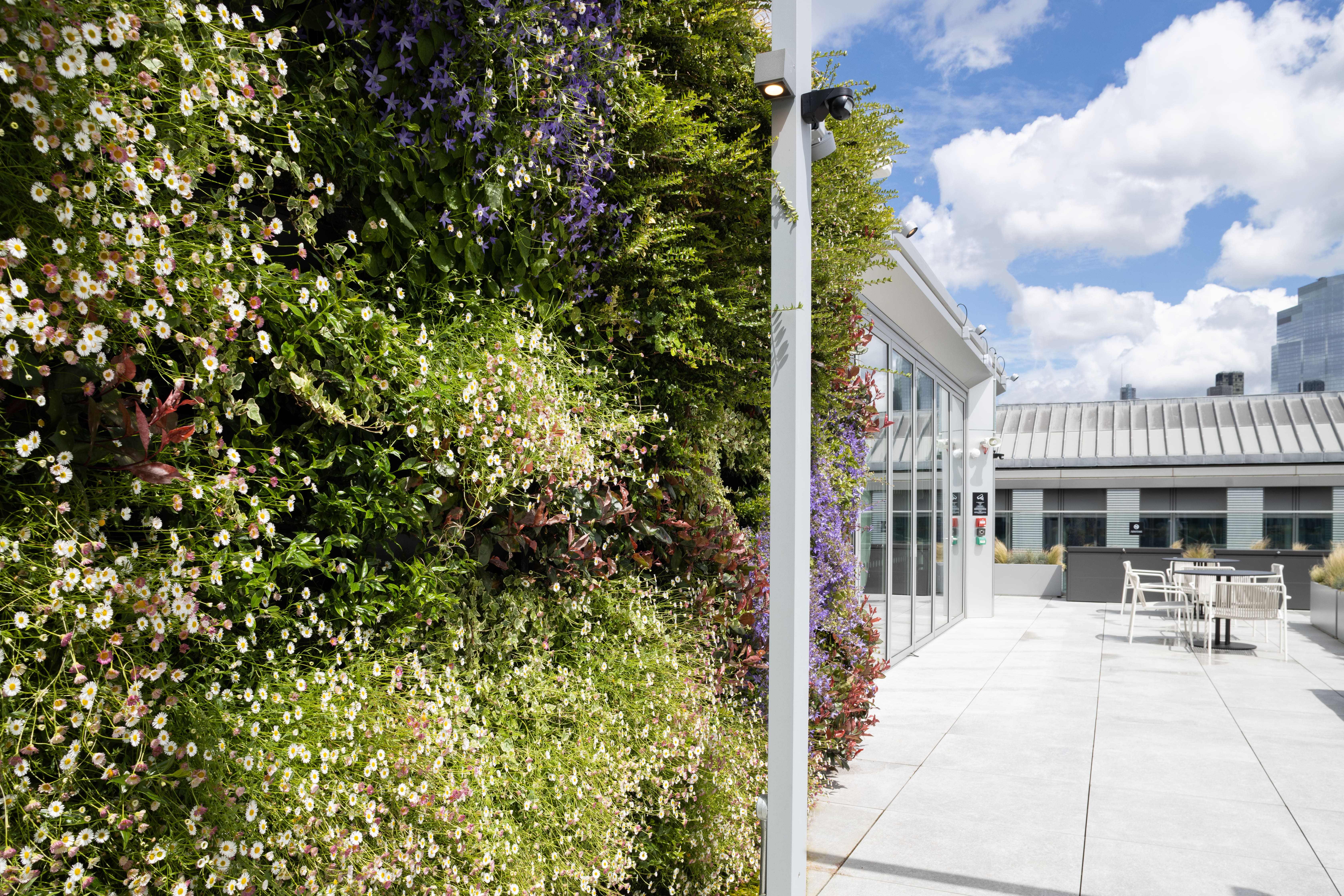 Rooftop Living Wall: Installed on the private terrace overlooking St Paul’s, the wildflower wall supports pollinators. During photography, bees were working the wall with visible pollen sacs – clear proof of impact.