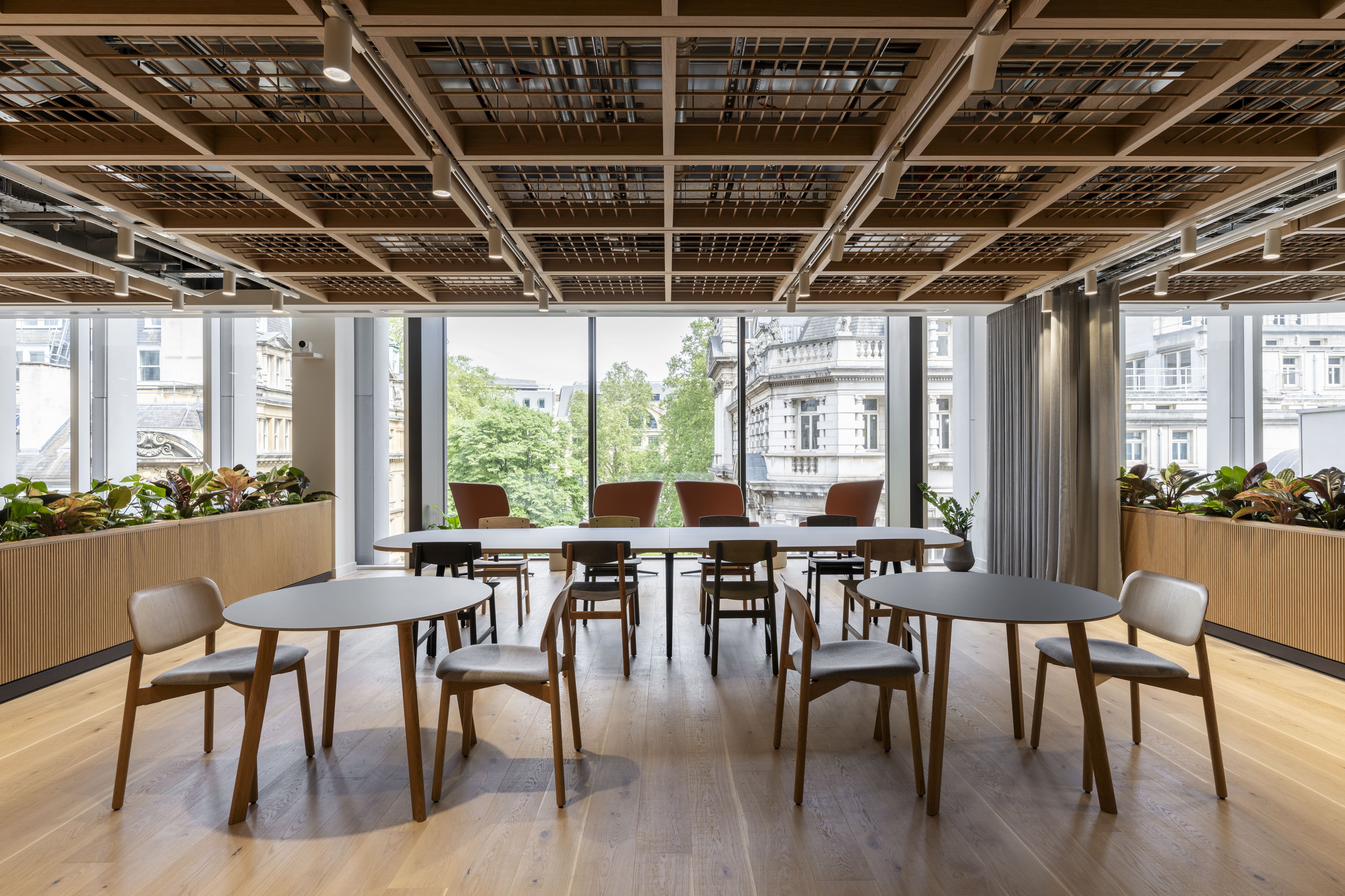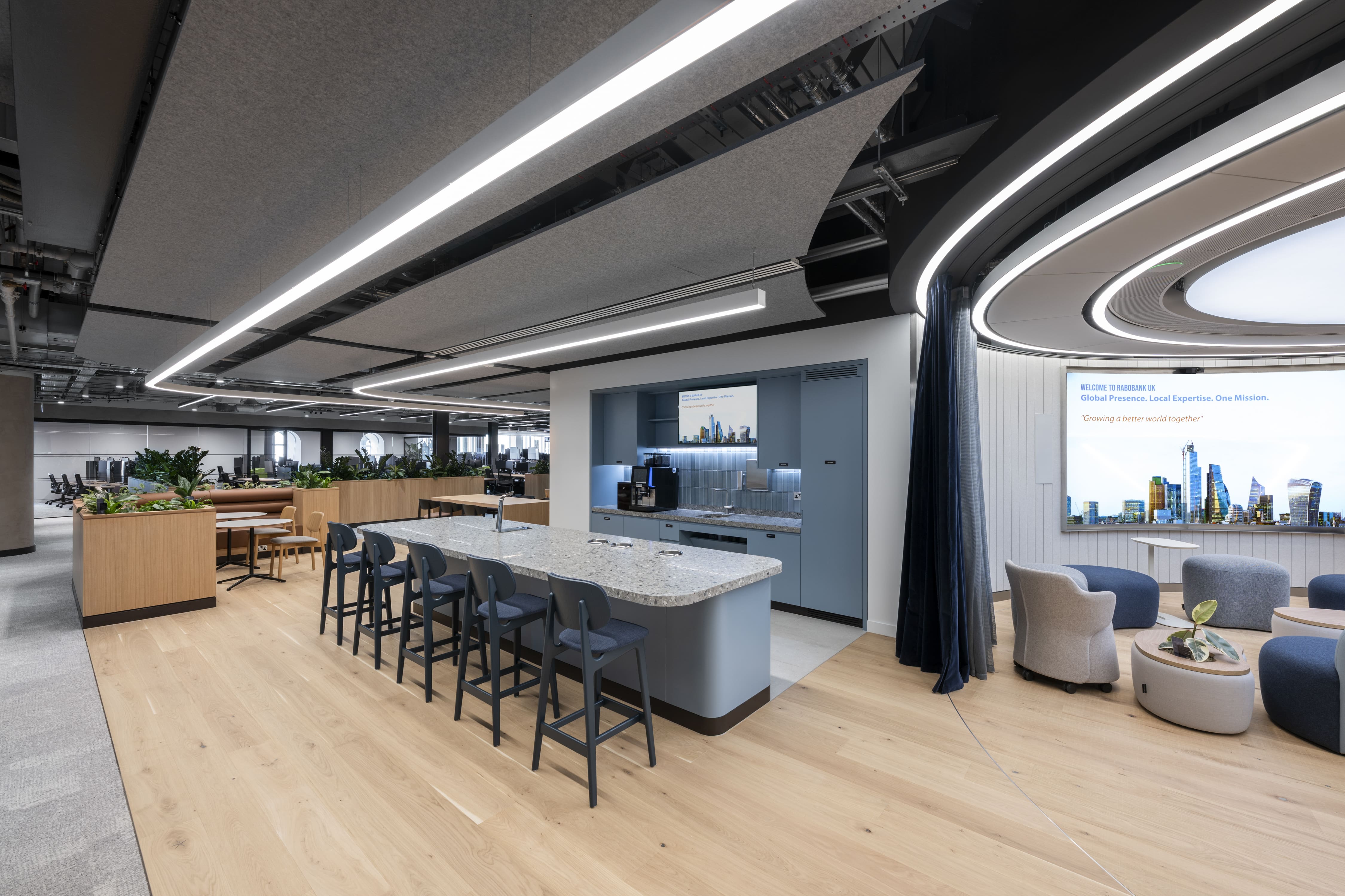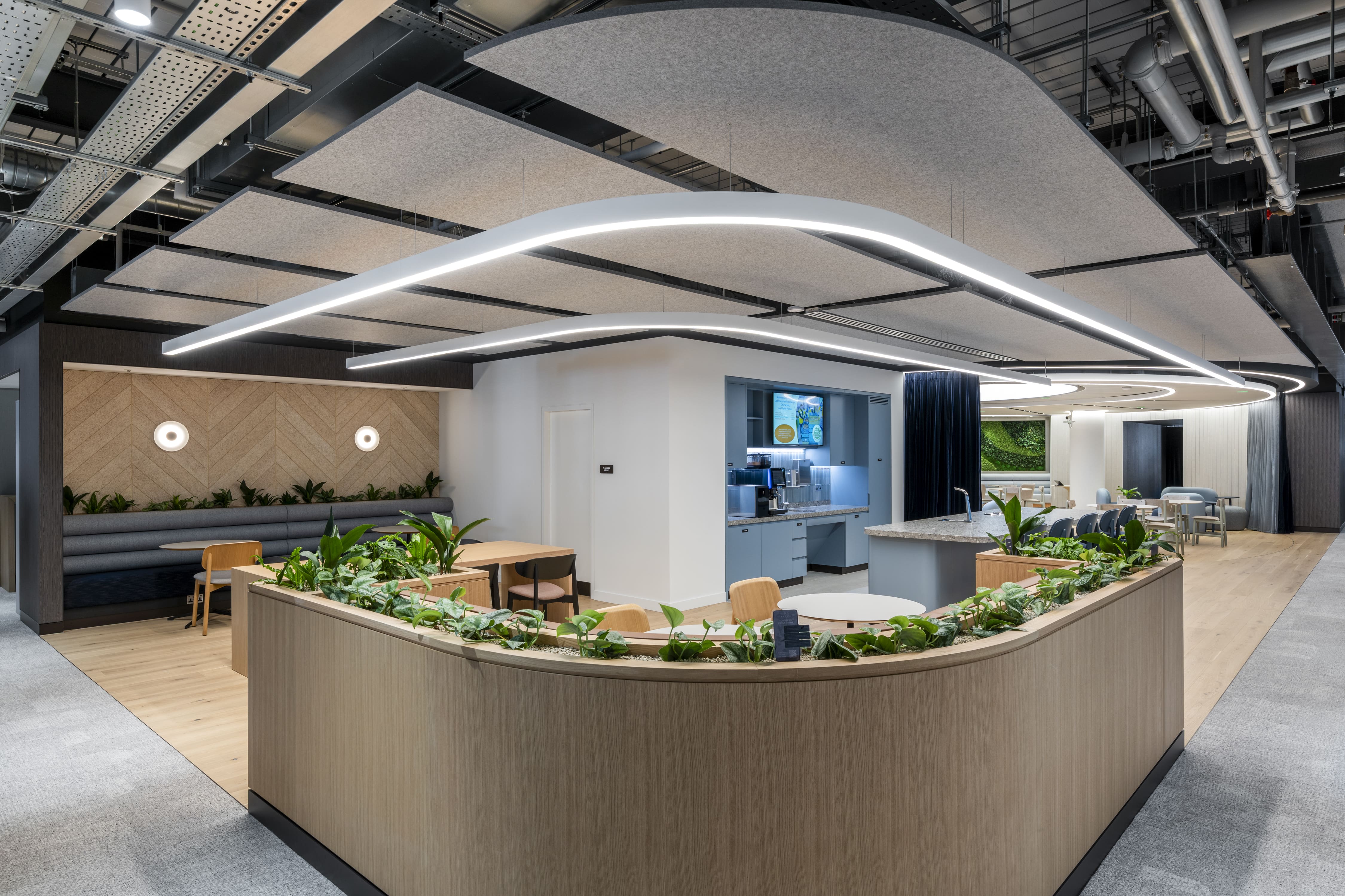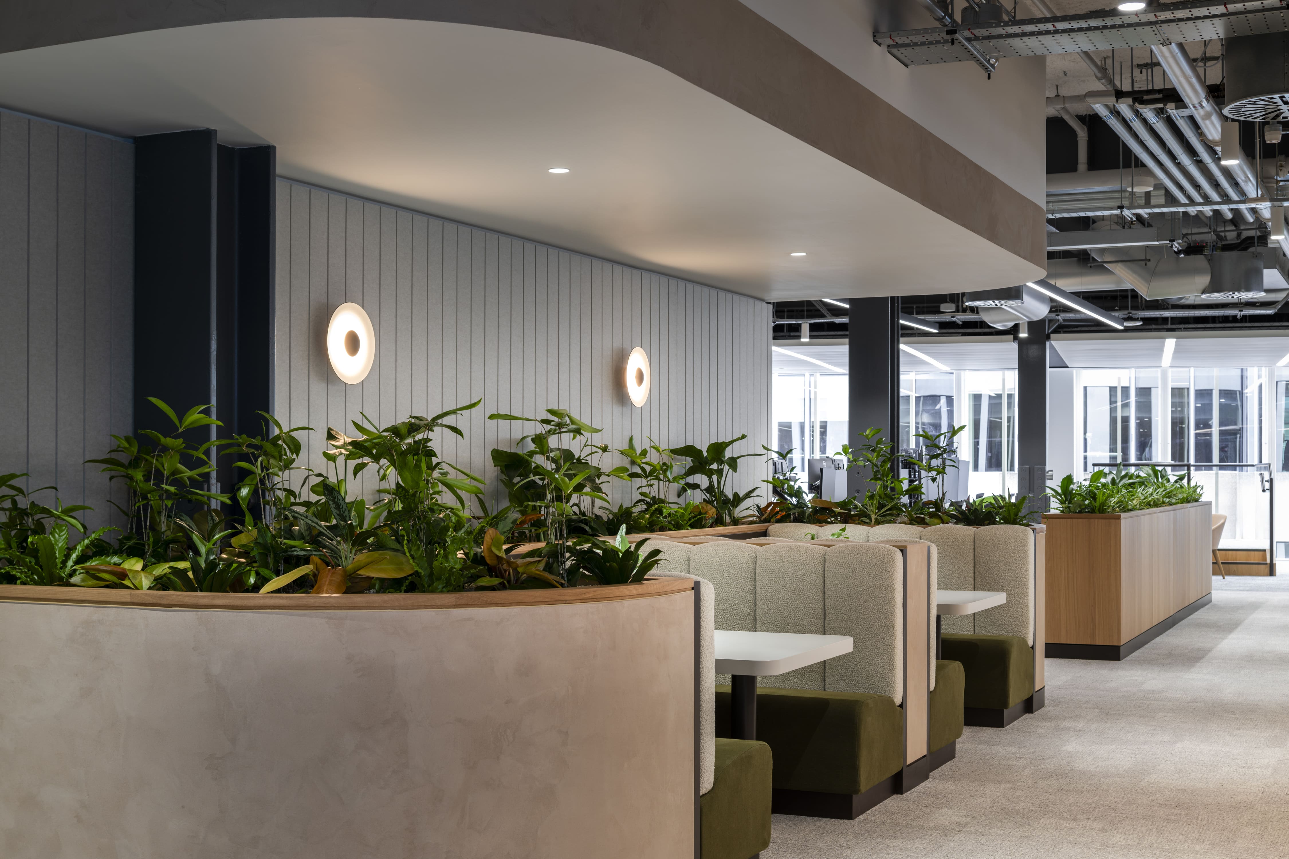 Much of the planting was designed directly into the bespoke joinery. This included curved troughs edging collaboration booths, low planters dividing workbenches, and continuous planting lines softening circulation routes.