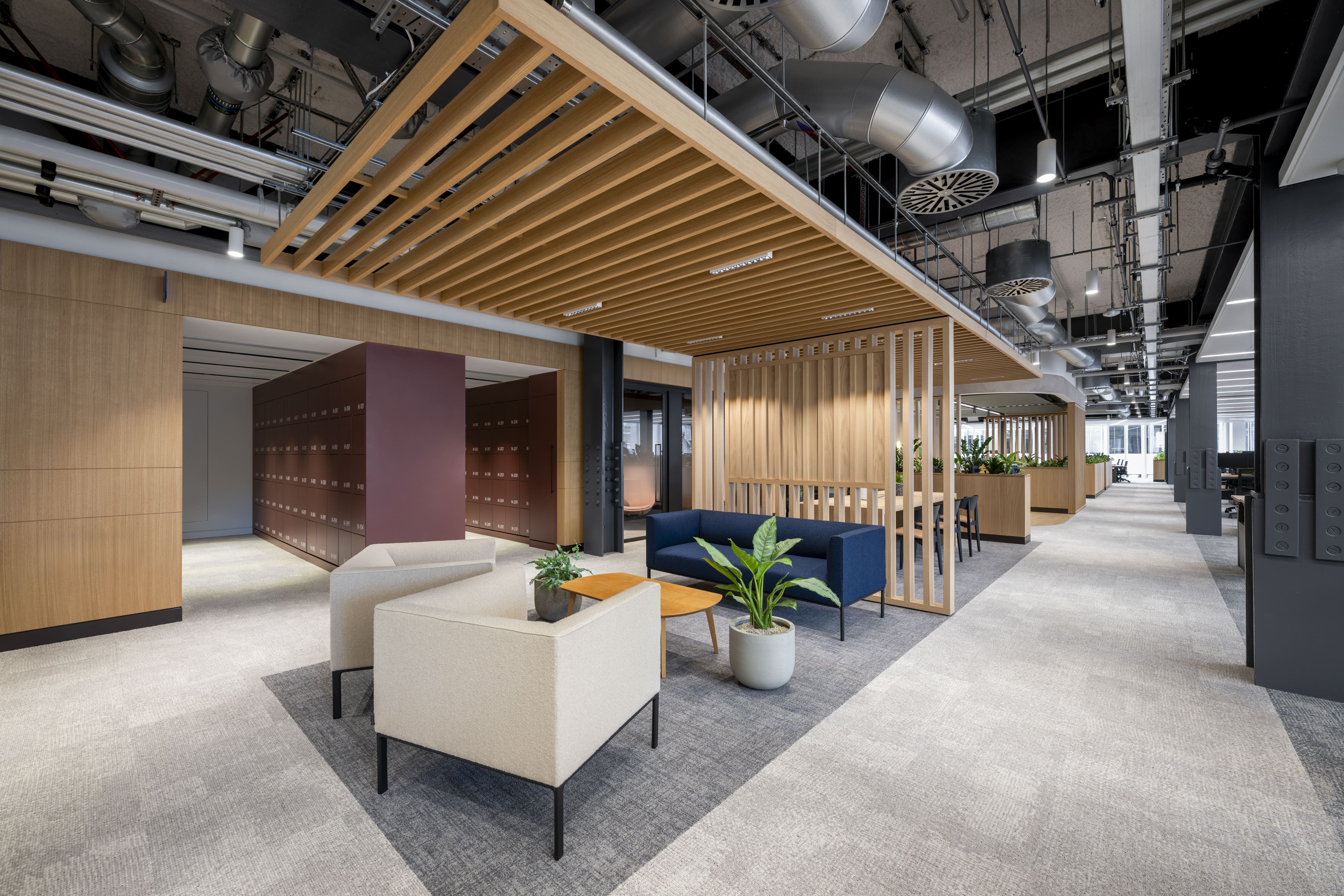 Bright office breakout space with sofas and timber ceiling detail.