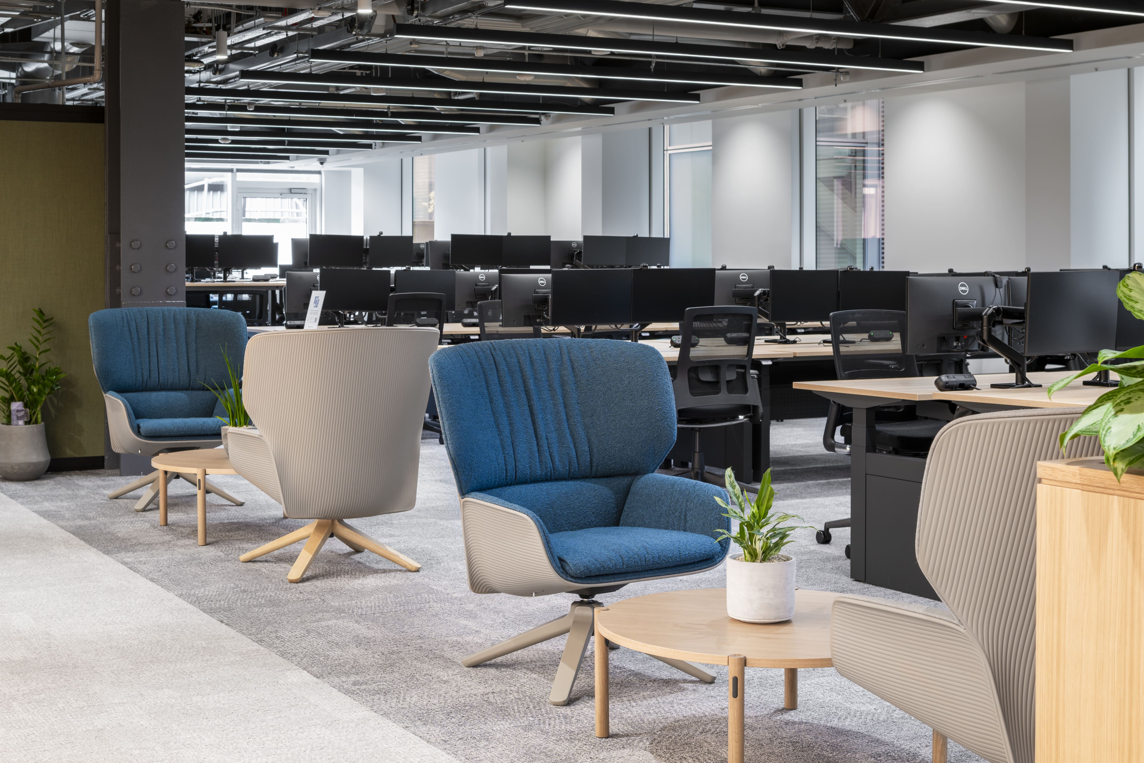 Freestanding planters were used as punctuation throughout the office, helping to break up open spaces and add vertical interest.  These plants were positioned to mark junctions, soften sightlines, and create natural pauses in circulation. By placing them at key points rather than scattering them evenly, they bring rhythm to the layout and give definition to otherwise open areas.