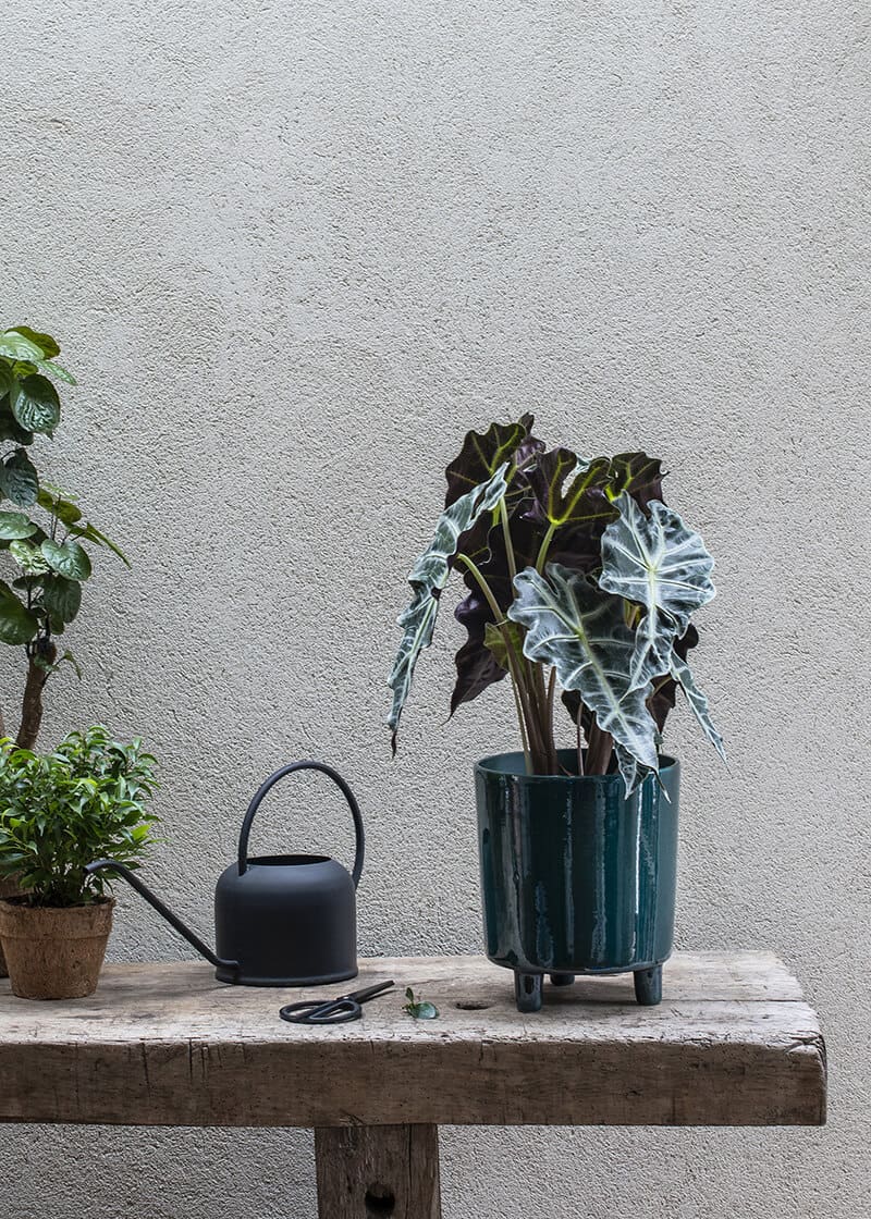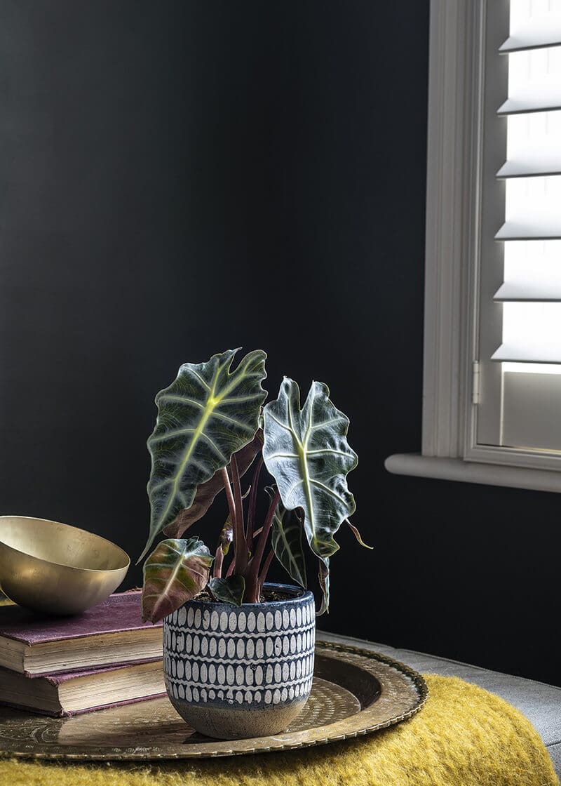 Alocasia species are a group of aroids from the tropics of Asia and Eastern Australia, often noted for their dramatic foliage, sometimes richly patterned. Poly has beautiful silvery-white veins on its dramatic dark green, arrow-shaped leaves, which can grow up to 30cm long. The undersides of the leaves are a deep red colour and they are help aloft by fleshy pale green stems.